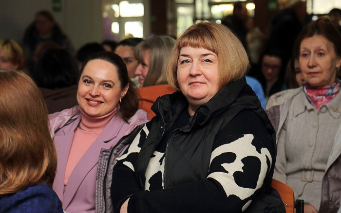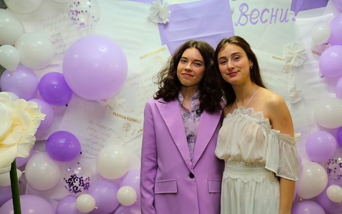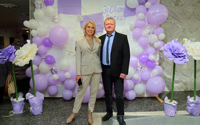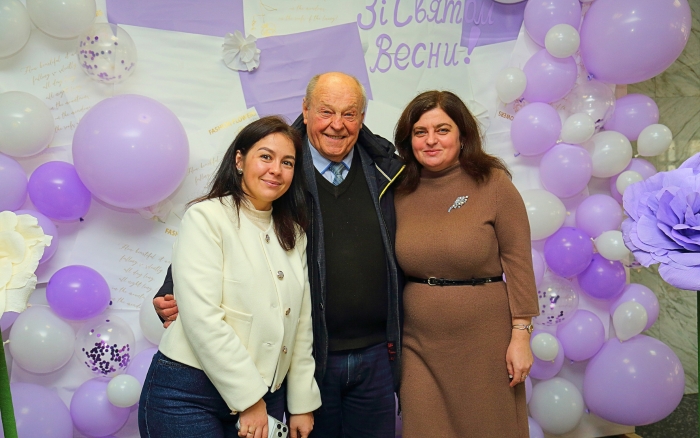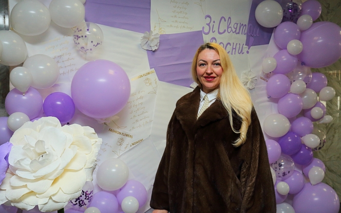 Святковий настрій починався ще у холі головного корпусу, де на гостей чекала весняна фотозона, оформлена у ніжних біло-бузкових тонах з квітами та повітряними кульками. Лунала музика, панувала легка, радісна атмосфера, а усмішки створювали відчуття справжнього свята.