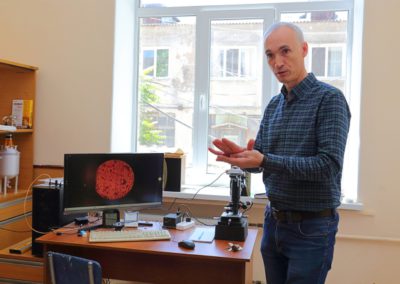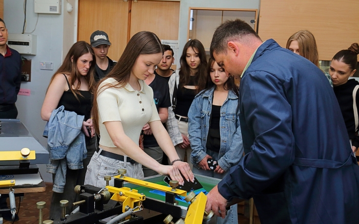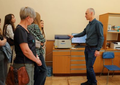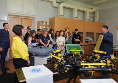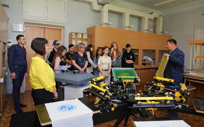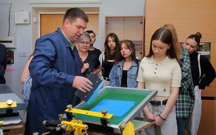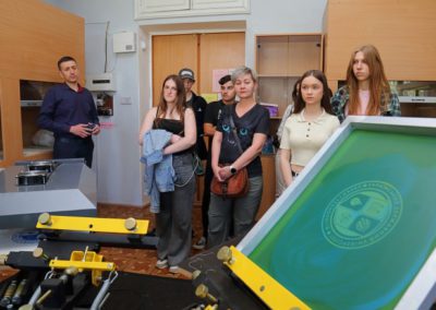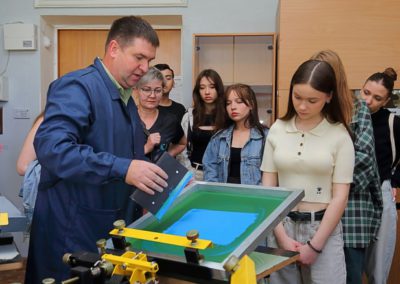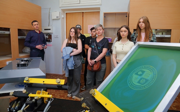 Далі школярі відвідали лабораторії, де ознайомилися з практичними напрямами підготовки студентів. У Лабораторії поліграфії та дизайну вони на власні очі побачили, як творчість поєднується з технологіями, та під керівництвом доцента кафедри технологій палив, полімерних та поліграфічних матеріалів Віталія Томіло власноруч спробували наносити логотип УДУНТ на екосумки.