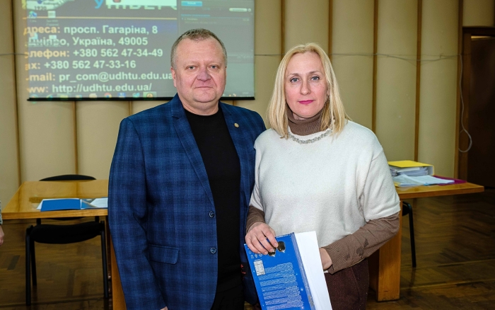 The meeting also noted the achievements of the institute’s students. Ivan Honcharuk, a student of the Faculty of Food and Chemical Technologies, was congratulated on receiving a Diploma of the 3rd degree at the International Student Professional Creative Competition “Materials Science”, which was held at the Kharkiv National Automobile and Road University during February–June 2025. For excellent work as a scientific supervisor, Olena Khomenko, associate professor of the Department of Chemical Technology of Ceramics, Glass and Biomedical Materials, received a corresponding certificate from the Kharkiv National Automobile and Road University.