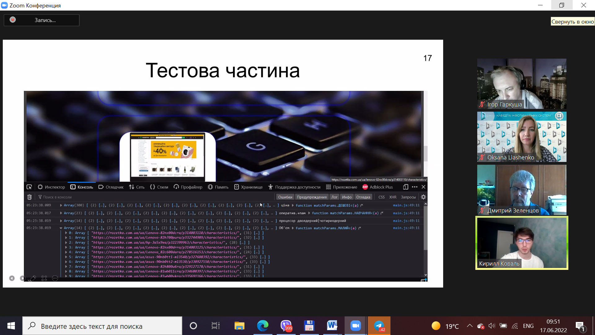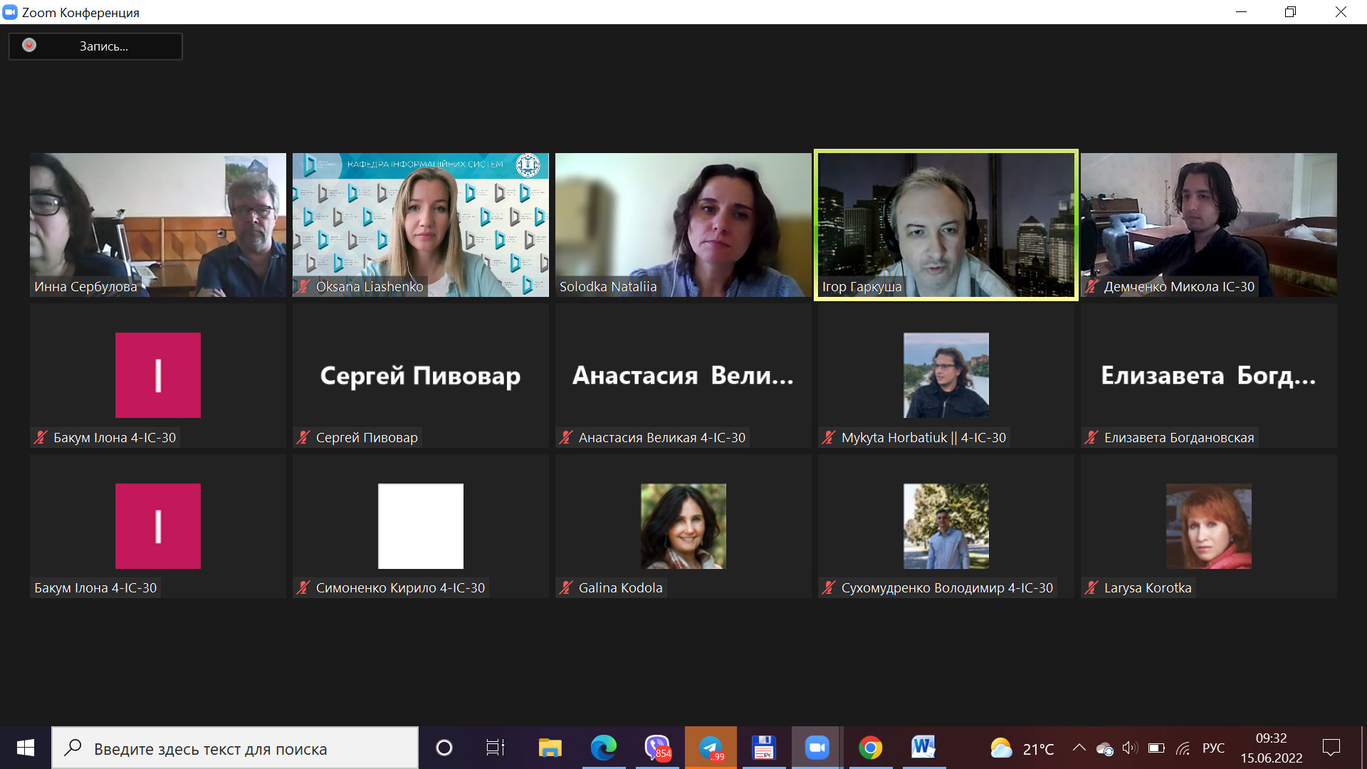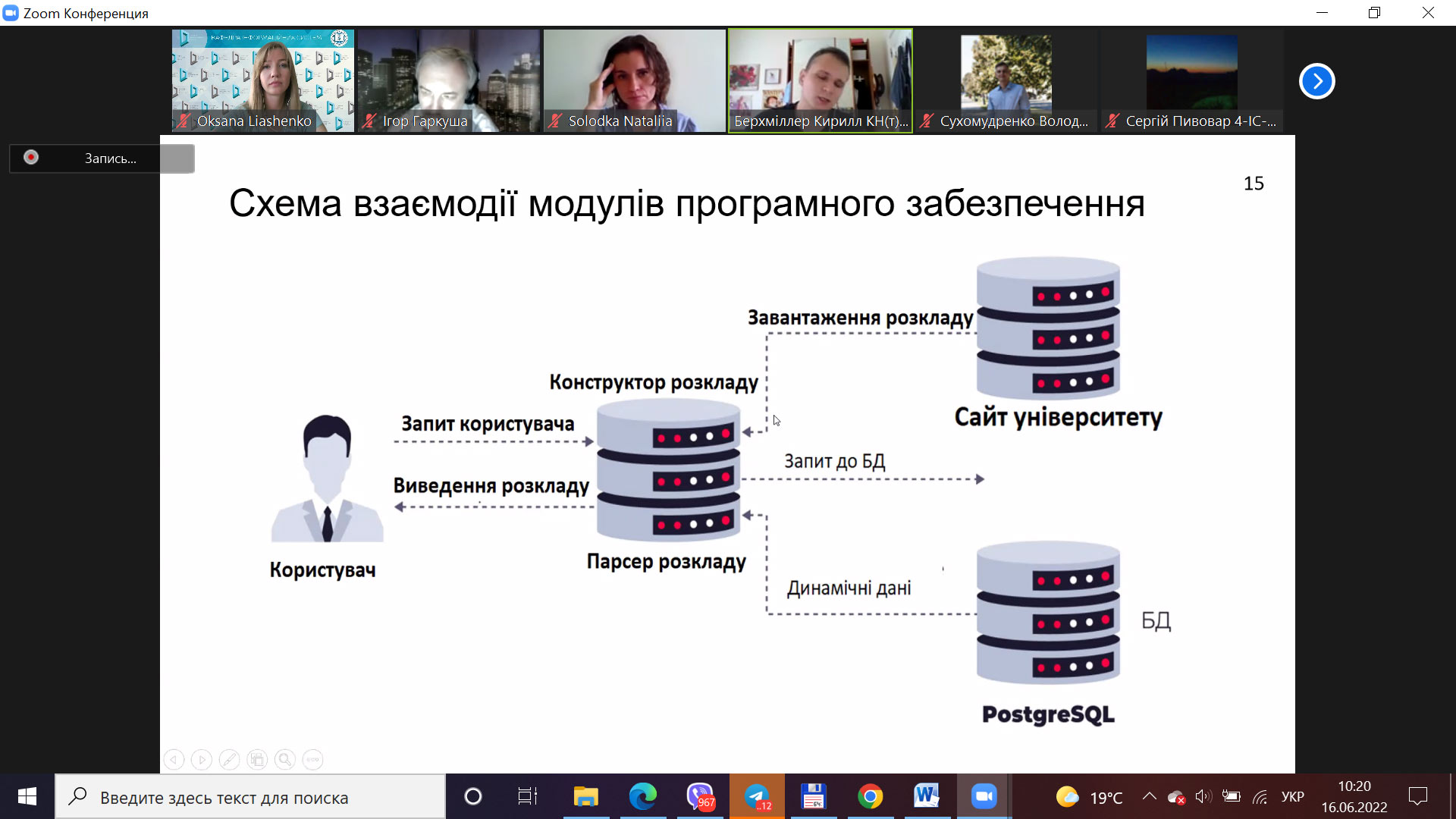 were held in the format of a zoom conference, at which 18 reports of award-winning students were presented. Among the successful defenses, 5 graduates of 2022 received diplomas with honors: Ilona Bakum, Mykola Demchenko, Serhiy Pivovar, Velyka Anastasia, Mykyta Horbatyuk.