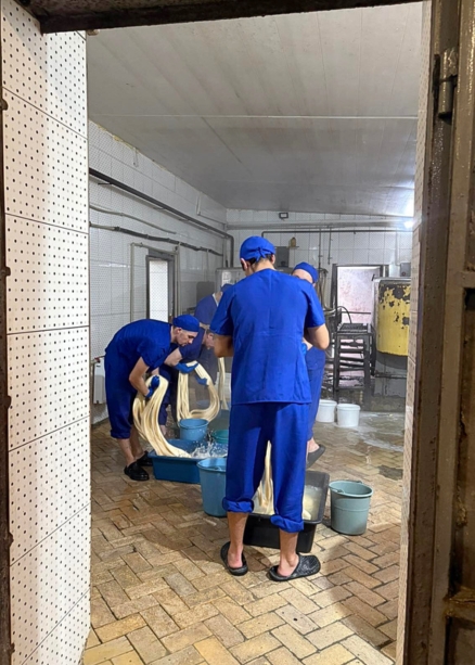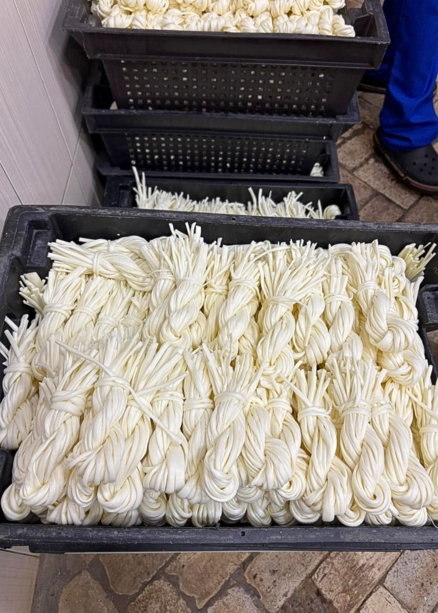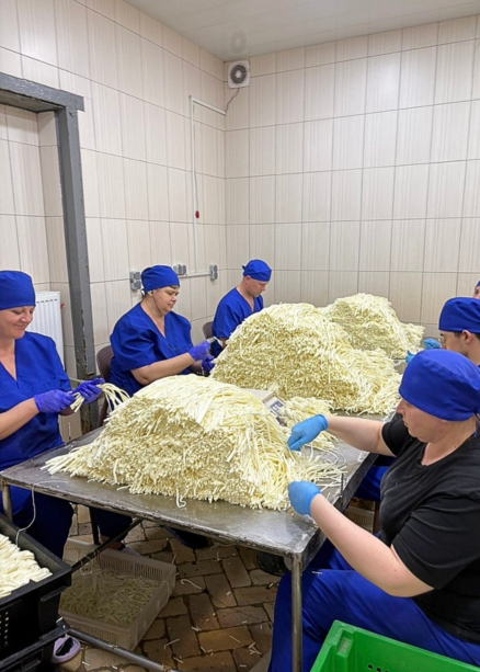 During the visit, the department employees got acquainted with the full cycle of production processes, learned about the features of making different types of cheeses – suluguni, pigtail cheese, brynza and others. They had the opportunity not only to see the technological stages, but also to personally participate in production – for the first time to make suluguni cheese on the latest equipment.