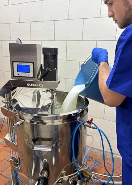 The practical part took place on a universal automatic Bondareff craft cheese factory with a capacity of 50 liters, which was recently purchased for the educational and scientific work of the department. This equipment allows you to control all stages of the technological process: heating and pasteurization of milk, ripening of the curd, mechanical cutting of cheese grains using a lyre or knife, kneading and drying of grains thanks to an adjustable mixer with reverse, forming a cheese layer, cheddarization. The equipment is also equipped with the ability to heat treat the cheese head and prepare ricotta from whey after cooking the main product.