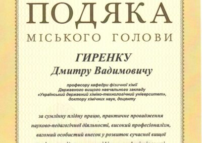 Professor Hyrenko Dmytro Vadymovych is one of the best lecturers in the Department, he is a talented teacher and a highly intelligent man. In November 2021, after many years of conscientious scientific and pedagogical work he was awarded the gratitude of Mayor Borys Filatov.