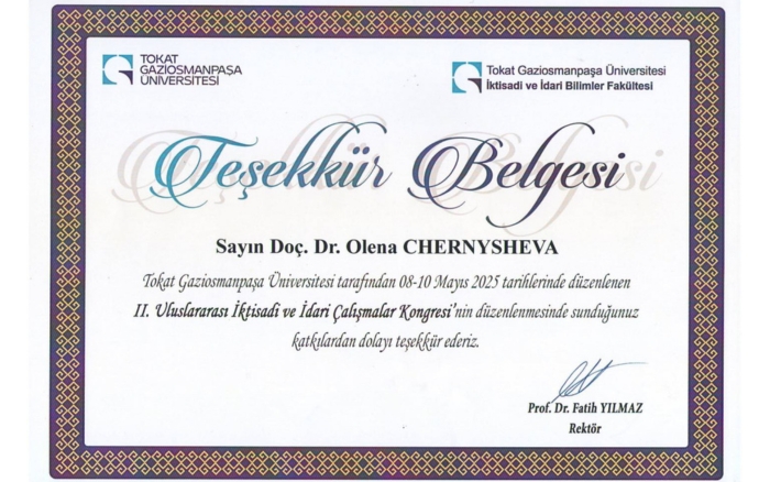 For the support and participation in the Organizing Committee of the Congress, Assoc. Prof. Elena CHERNYSHEVYA received gratitude from the Rector of Tokat Gaziosmanpaşa University, Prof. Fatih YİLMAZ.
