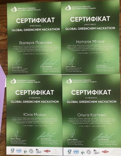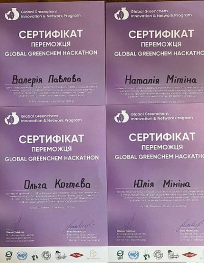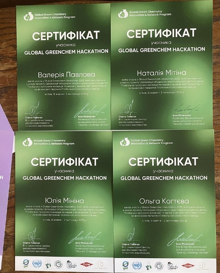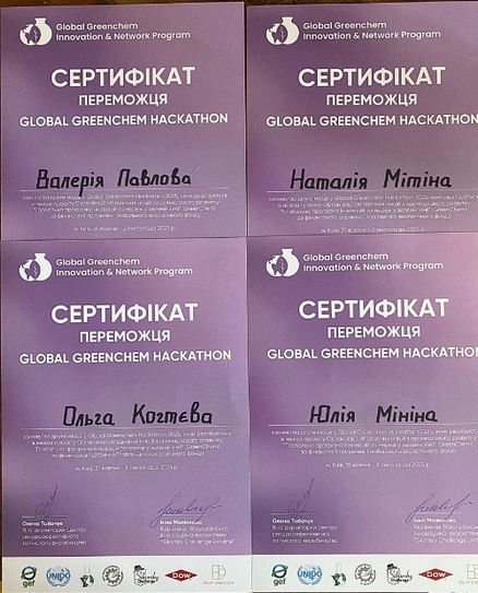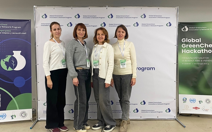 The team of scientists of USUST “PRO-YVON” from the Department of Biotechnology and Life Safety of the National Research Institute of USUCT under the leadership of the head of the department Natalia Mitina won II place and a prize fund of $1000 at the international Global GreenChem Hackathon 2025, which was held in Kyiv from October 31 to November 2, 2025 as part of the Sikorsky Challenge 2025 festival and the UNIDO GreenChem project.