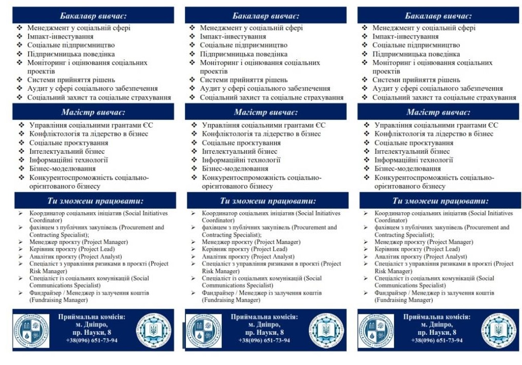 Протягом навчання у магістратурі за освітньою програмою «Управління соціальними проектами» студенти досліджують середовище та зацікавлених сторін проекту, визначають джерела та можливості фінансування проектів, методи оцінки ефективності проекту (специфіку оцінки соціальних проектів), знаходять грантові програми та самостійно готують соціальний проект, який вже є готовим продуктом, що спрямований на вирішення соціально значущої задачі.
