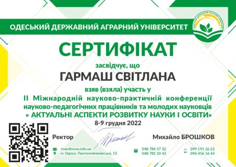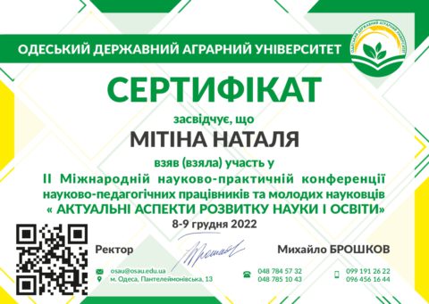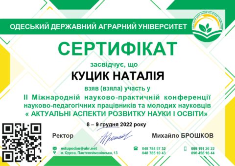 8 грудня 2022 року на базі Одеського державного аграрного університету проведена в онлайн режимі ІІ Міжнародна науково-практична конференція науково-педагогічних працівників та молодих науковців «АКТУАЛЬНІ АСПЕКТИ РОЗВИТКУ НАУКИ І ОСВІТИ». Партнери конференції: ZipGrow Inc. (Канада); Ризький технічний університет (Латвійська республіка); Технічний університет Молдови; Поморська Академія у Слупську (Польща); Інститут ґрунтознавства, агротехнологій та захисту рослин "Микола Пушкаров" – ІГАЗР (Болгарія); Wroclaw University of Economics (Poland); Istambul University Cerrahpasa Faculty of Veterinary Medicine; Organisation Mondiale de la Santé Animale.