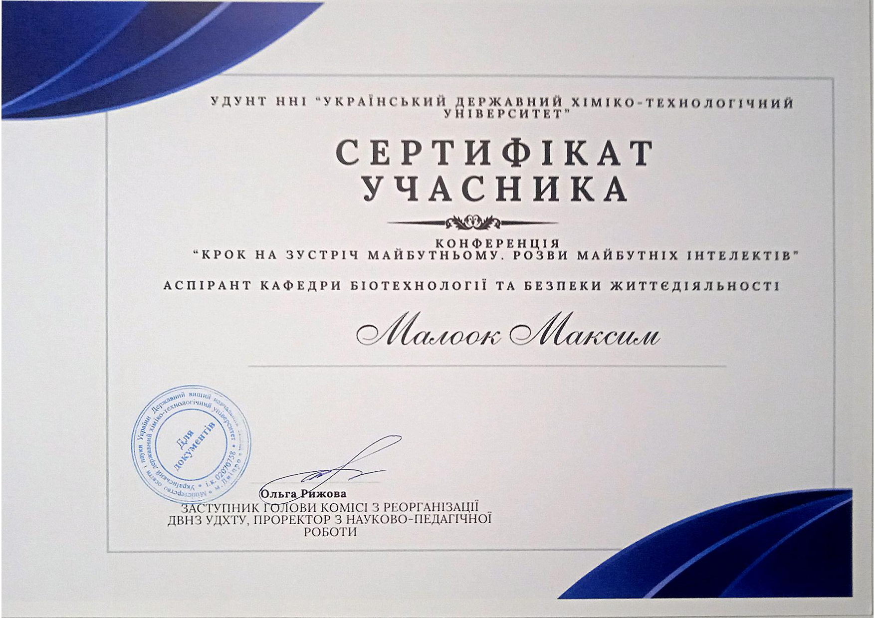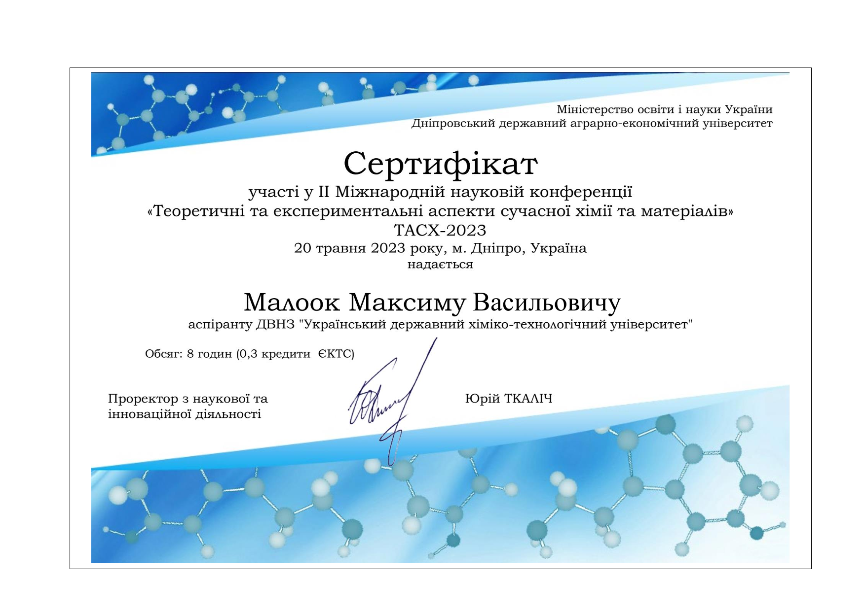 Захистив у 2024 році в Українському державному університеті науки та технологій дисертацію за темою «Синтез інгібіторів нітрифікації на основі координаційних сполук Cu(ІІ), Zn(ІІ), Co(ІІ), Mn(ІІ), Fe(ІІ)».