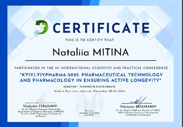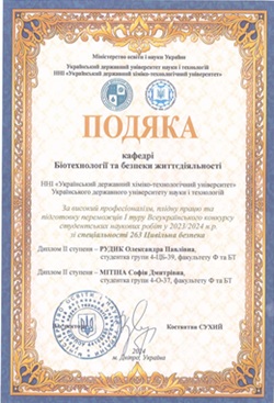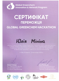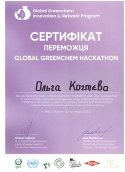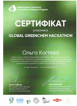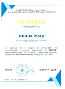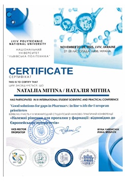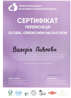 Захистила у 2025 році в Українському державному університеті науки та технологій дисертацію за темою “Синтез та гетероциклізації амідоалкілованих 1,2-біс(тіокарбомоїл)гідразинів”
