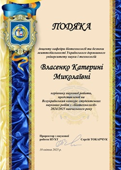Аспірантка кафедри біотехнології та БЖД 3 року навчання за спеціальністю 162 Біотехнології та біоінженерія