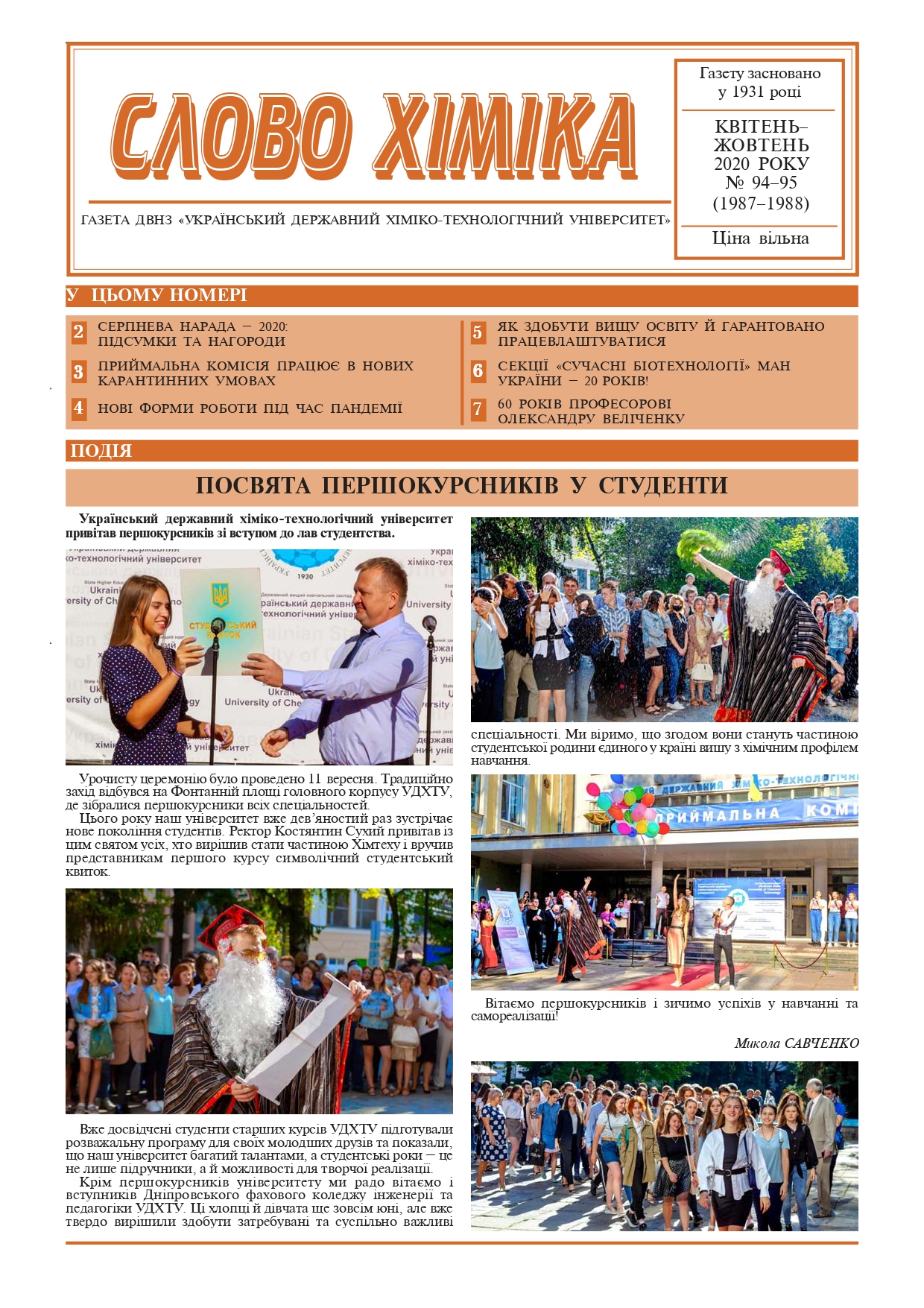 Намагаючись вести демократичну редакційну політику, газета “Слово хіміка” запрошує студентів, викладачів, науковців, присилати свої статті для публікації. Повідомляйте нас про будь-які події з життя університету. Висловлюйте свої побажання та пропозиції. Розповідайте про свої проблеми і досягнення.