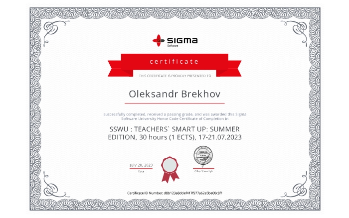 Під час літніх канікул у липні 2023р. викладачі кафедри інформаційних систем взяли участь у навчальному курсі Teachers Smart Up: Summer Edition 2023 від партнера нашого університету – ІТ-компанії Sigma Software.