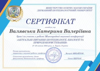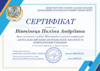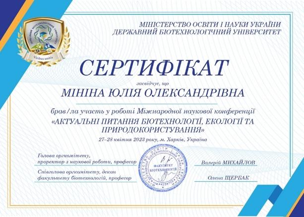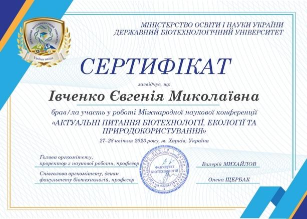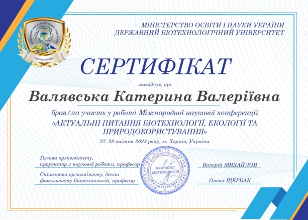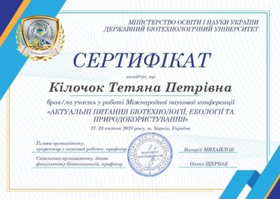 У роботі Міжнародної наукової конференції секції конференції «Біотехнології: харчова та фармацевтична, біотехнологія у тваринництві та ветеринарії, екологічна біотехнологія та біотехнології в рослинництві, молекулярна біотехнологія» брали участь здобувачі, аспіранти, викладачі кафедри біотехнології, охорони праці та БЖД. За участь у роботі Міжнародної наукової конференції отримали сертифікати: