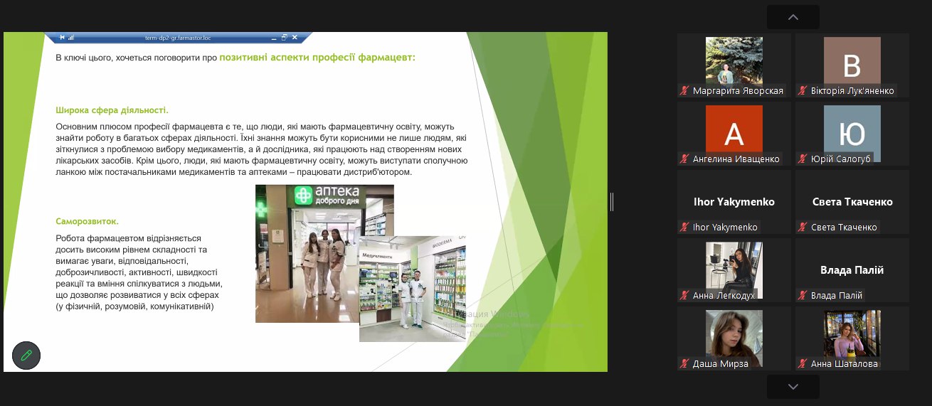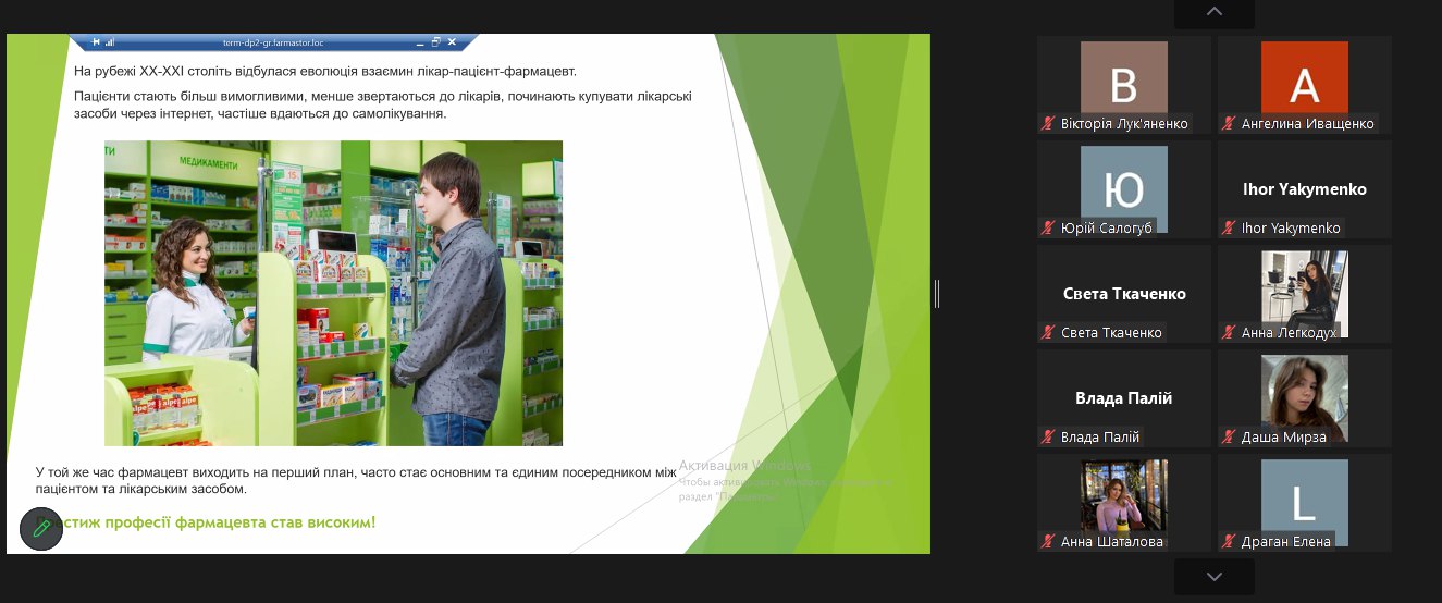 Дякуємо нашим гостям та організатору онлайн-конференції, викладачу кафедри Ф та ТОР Ломинозі О. О., за цікаву зустріч, співпрацю та важливий внесок у процес підготовки майбутніх фармацевтів.