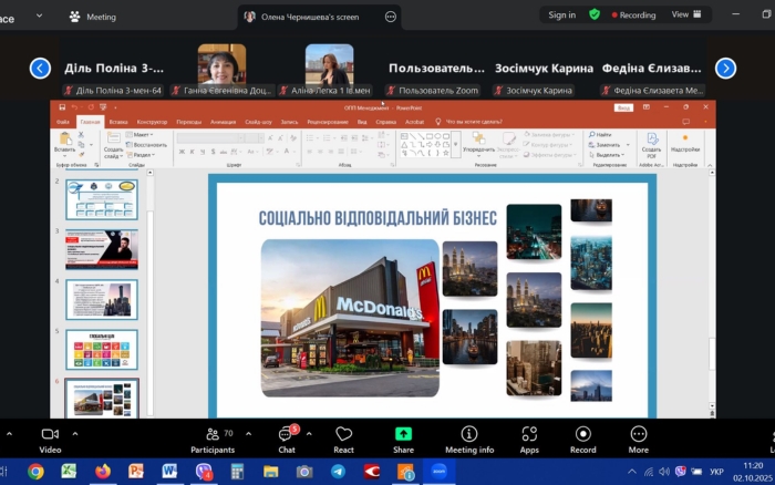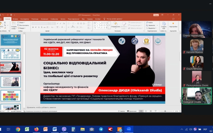 2 жовтня 2025 року для студентів освітньо-професійної програми «Менеджмент і адміністрування» спеціальності D3 «Менеджмент» відбулася онлайн-лекція на тему «Соціально відповідальний бізнес: ідея, виклики часу та глобальні цілі сталого розвитку».