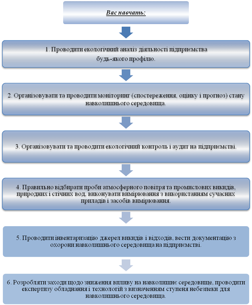 - реалізовувати екологічні заходи зі зменшення негативного впливу на довкілля підприємств різних галузей промисловості;