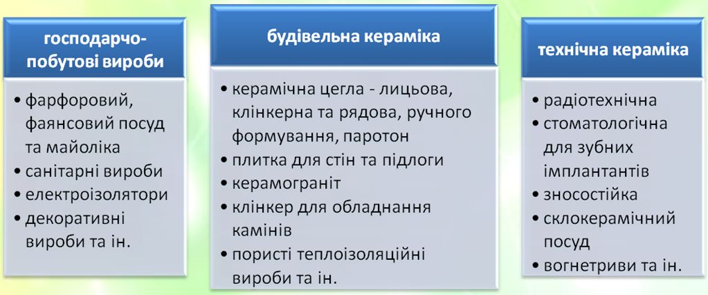 Керамічна плитка – облицювальна та для підлоги, керамограніт. Потужний розвиток виробництва керамічної плитки в Україні почався з середини 2000-х років, коли з’явились такі підприємства, як ПрАТ «Інтеркерама» (м. Дніпропетровськ), ТОВ «Церсаніт-Інвест» (м. Новоград-Волинський), АТ «Зевс-Кераміка» (м. Слов’янськ). На цих сучасних підприємствах високий ступінь автоматизації процесу, високопродуктивне обладнання, але без спеціалістів з виробництва кераміки жадне з них не зможе ефективно працювати.