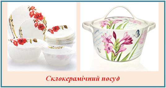 Cклокераміка. В наш побут склокерамічний посуд прийшов у другій половині ХХ століття внаслідок бурхливого розвитку сучасних технологій і відкриттям нових властивостей матеріалів. Тарілки, піали, салатники, страва, стакани та інше. Склокераміка цінується за приємний зовнішній вигляд, легкість і міцність і є затребуваною поряд зі склом і порцеляною. Виробництво склокерамічнго посуду також включає наступні операції: майбутній посуд проходить процес формування, прокатки або видування; заготівля – форма, що піддається термічному нагріванню в ході, якого кристалічні решітки матеріалу кристалізуються і створюють «зародкову основу» нової якості; у процесі подальшого нагрівання, навколо «зародкових» кристалів починається формування і вторинна кристалізація вільних ядер, кількість яких безупинно зростає, заповнюючи весь вільний об’єм виробу. В результаті цього процесу виникає суцільна і однорідна кристалічна маса великої щільності, в якій повністю відсутні пори, тому отримана склокераміка має дуже високу твердість, не деформується під впливом нагріву і різкого охолодження, також має високу внутрішню міцність.
