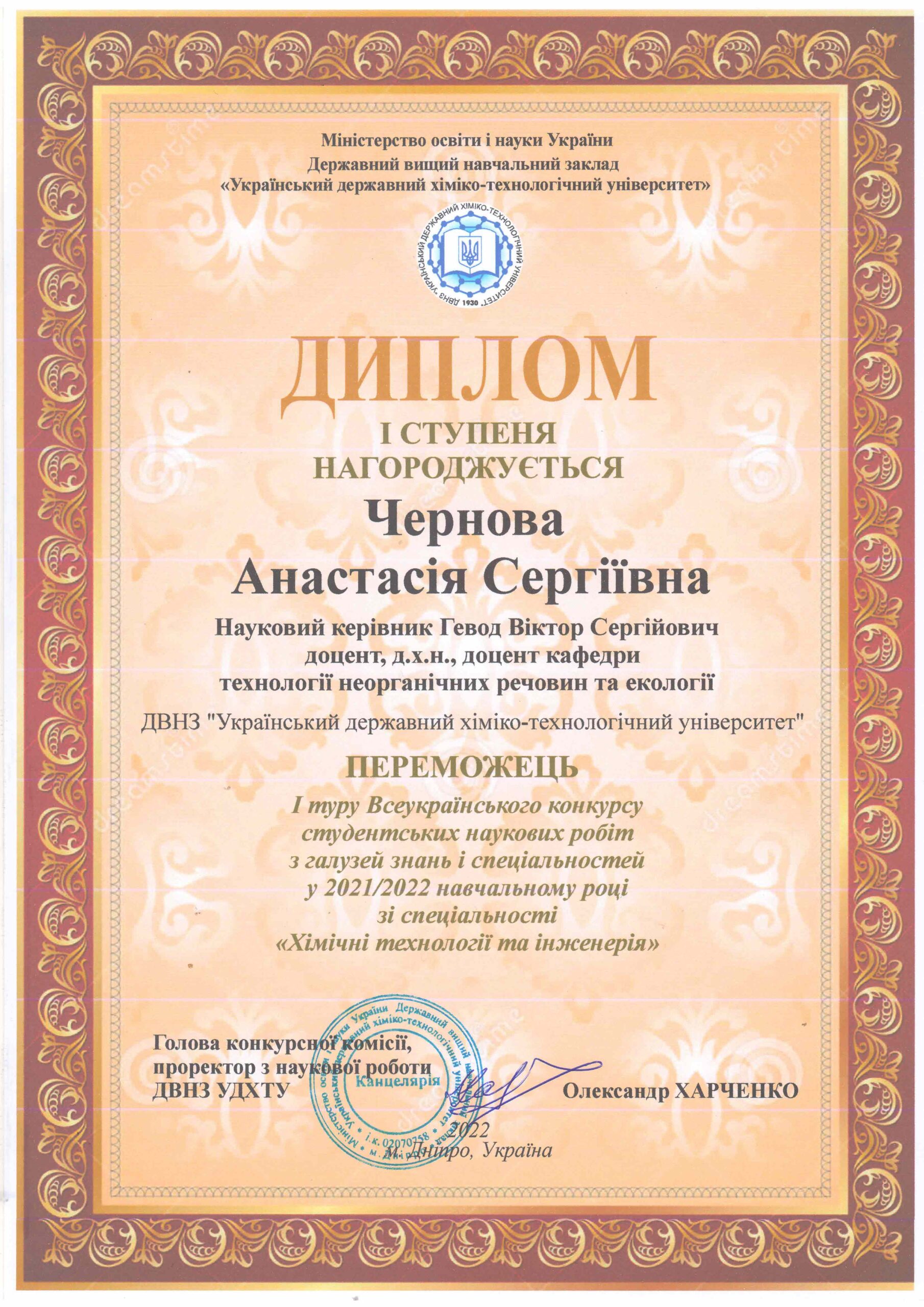 - Чернова А.С. – Тема роботи: «Реалізація принципів «зелених технологій в малих системах децентралізованого очищення питної води від нітратів», науковий керівник – доцент, д.х.н. Гевод В. С.