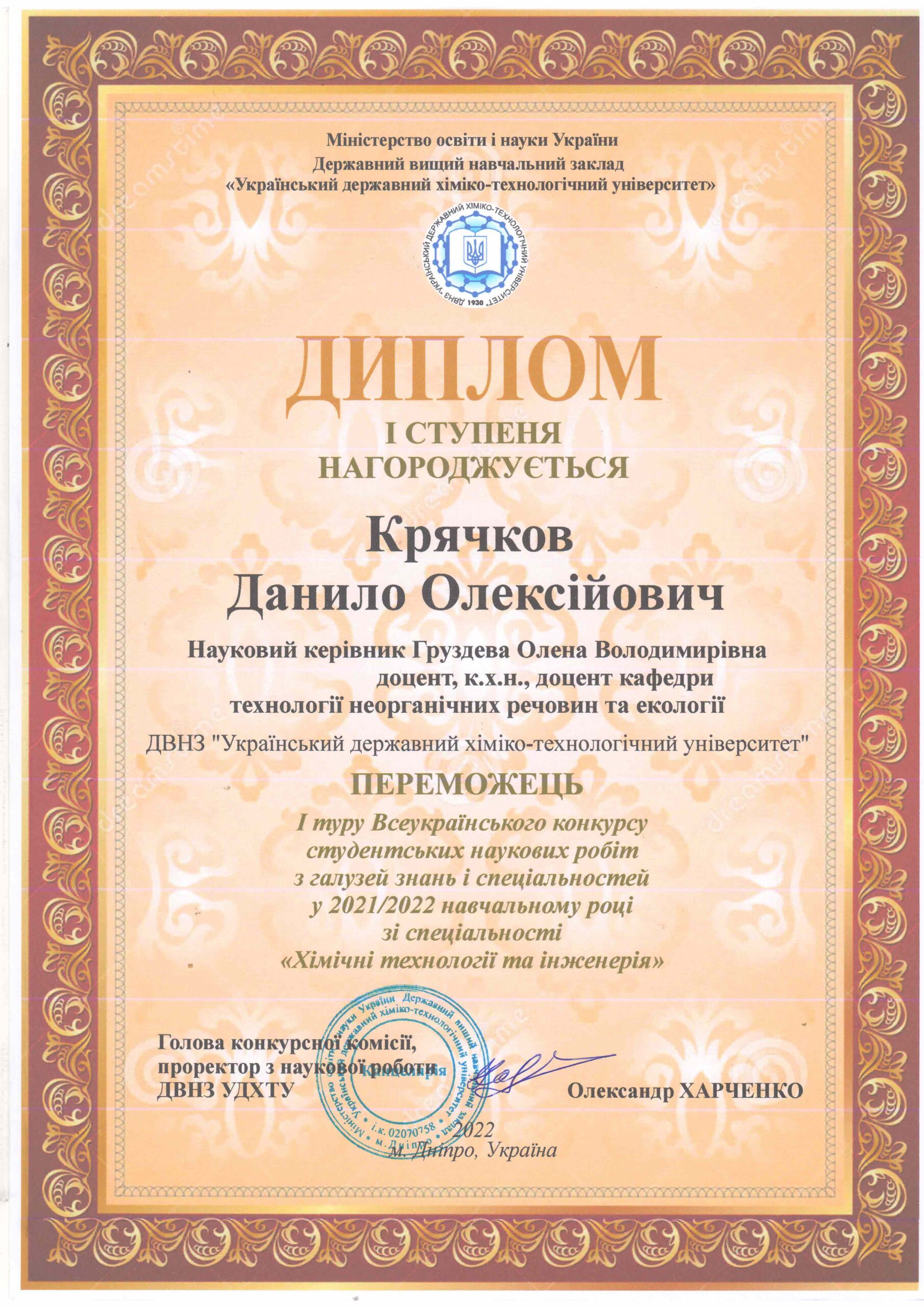 На кафедрі технології неорганічних речовин та екології було підведено підсумки 1-ого етапу Всеукраїнського конкурсу студентських наукових робіт зі спеціальності 161 – хімічні технології та інженерія у 2021-22 навчальному році.