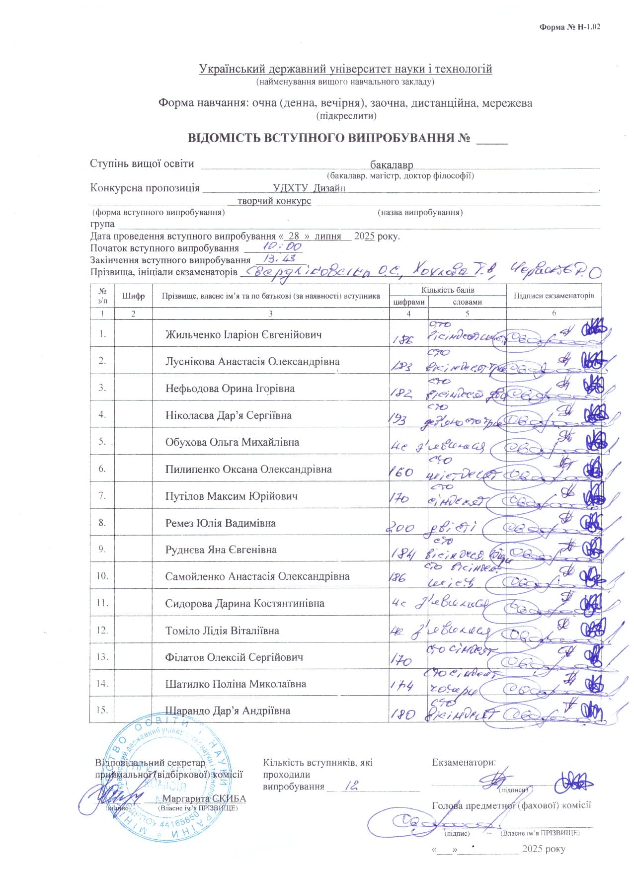 - 15 липня 2025 року – відеозапис та відомість вступного випробування (творчий конкурс) конкурсної пропозиції В2 Дизайн