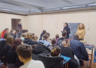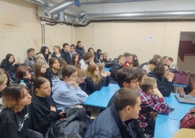 Попри повітряну тривогу, зустріч пройшла в укритті у конструктивній атмосфері – учні активно ставили запитання щодо вступу, навчального процесу та перспектив працевлаштування.