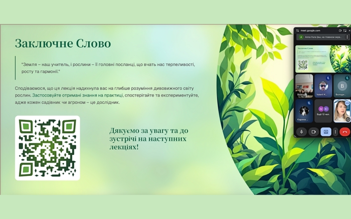 Першою темою стала лекція «Живлення рослин». Основний матеріал представила Анна Гура, доцент кафедри процесів, апаратів та загальної хімічної технології, заступник декана факультету харчових та хімічних технологій і гарант спеціальності А5 «Професійна освіта». Вона поділилася практичним досвідом та актуальними прикладами з аграрної хімії.