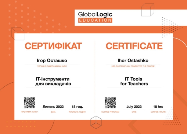 З 4 липня до 3 серпня 2023 р. викладачі кафедри інформаційних систем долучилися до курсу від GlobalLogic Education “ІТ-інструменти для викладачів”. Курс проходив у форматі онлайн-лекцій з можливістю поспілкуватися з експертами ІТ-галузі. Зміст курсу охоплював широкий спектр тем: тренди ІТ, основи time management, принципи ефективної комунікації, штучний інтелект, кібербезпеку та багато іншого.