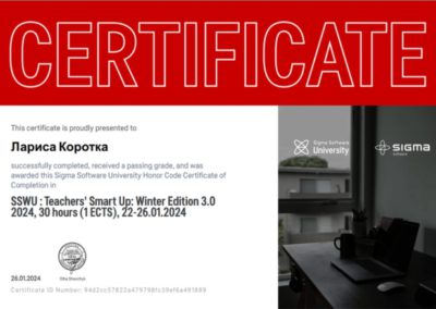 Традиційно під час зимових канікул та періоду відпусток викладачі кафедри долучились до участі у навчальному курсі Teachers’ Smart Up: Winter Edition 3.0 від експертів компанії Sigma Software, яка є партнером нашого університету. Насичений оновлений інтенсив тривав 5 днів, проходив за партнерства Асоціації “ІТ Ukraine” та був корисний для викладачів ІТ-спеціальностей, які прагнуть бути ознайомлені з основними світовими трендами в освіті. Спеціалісти Sigma Software поділилися практичними навичками у популярних ІТ напрямках, а також вміннями, що стануть корисними у навчальному процесі.