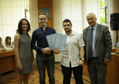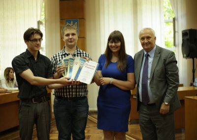 Почесною грамотою Гевода Віктора Сергійовича, доцента кафедри технології неорганічних речовин та екології, наукового керівника переможця Всеукраїнського конкурсу студентських наукових робіт зі спеціальності «Хімічні технології та інженерія» (диплом ІІІ ступеня) Борисова Івана Олександровича.