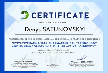 Аспіранти кафедри біотехнології та безпеки життєдіяльності Сатуновський Денис (керівник Мітіна Н.Б.), Тимошенко Владислав (керівник Герасименко В.О.) брали участь у VII Міжнародній науково-практичній конференції «KyivLvivPharma-2025. Фармацевтична технологія та фармакологія в забезпеченні активного довголіття” та у спеціалізованій ХІІІ науково-практичній конференції з міжнародною участю Школи молодих науковців АТ “Фармак” «Наука, інновації та якість в сучасному фармацевтичному виробництві».