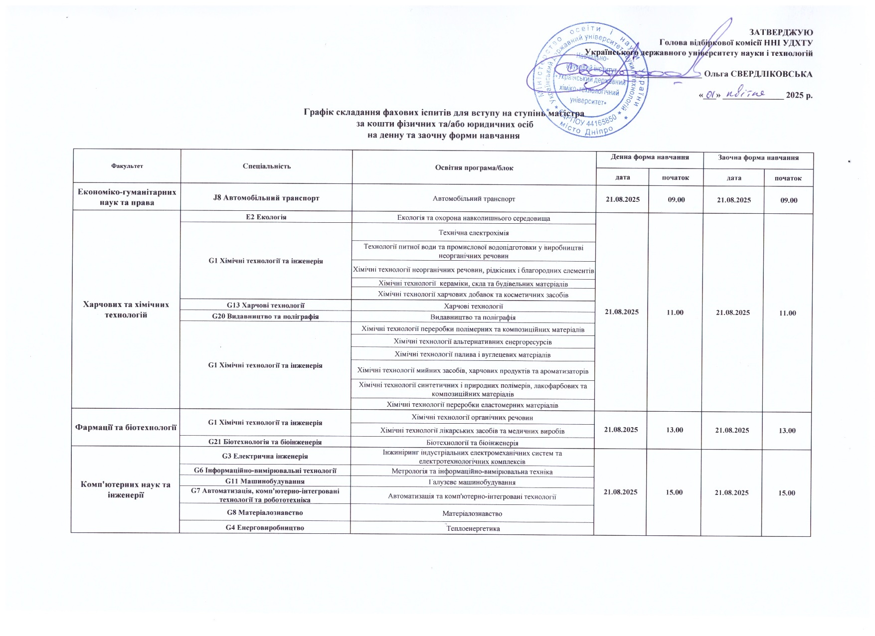 Графік складання фахових іспитів для вступу на ступінь магістра за державним/регіональним замовленням та за кошти фізичних та/або юридичних осіб на денну та заочну форми навчанняГрафік складання фахових іспитів для вступу на ступінь магістра за кошти фізичних та/або юридичних осіб на денну та заочну форми навчання