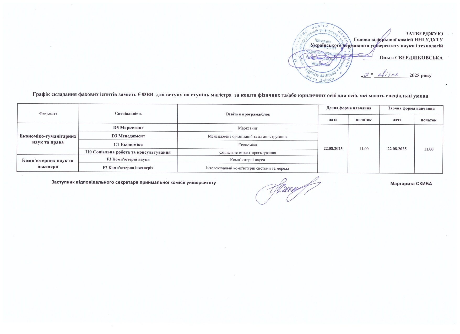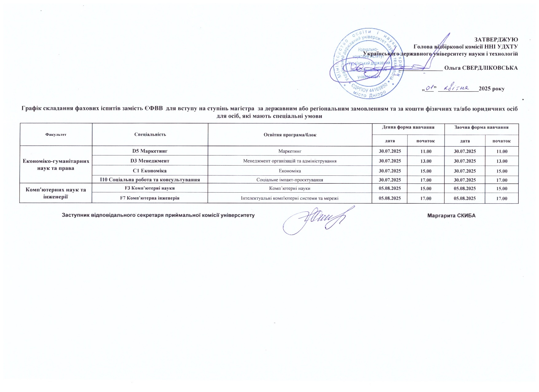 Графік складання фахових іспитів замість ЄФВВ для вступу на ступінь магістра за державним або регіональним замовленням та за кошти фізичних та/або юридичних осіб для осіб, які мають спеціальні умовиГрафік складання фахових іспитів замість ЄФВВ для вступу на ступінь магістра за кошти фізичних та/або юридичних осіб для осіб, які мають спеціальні умови