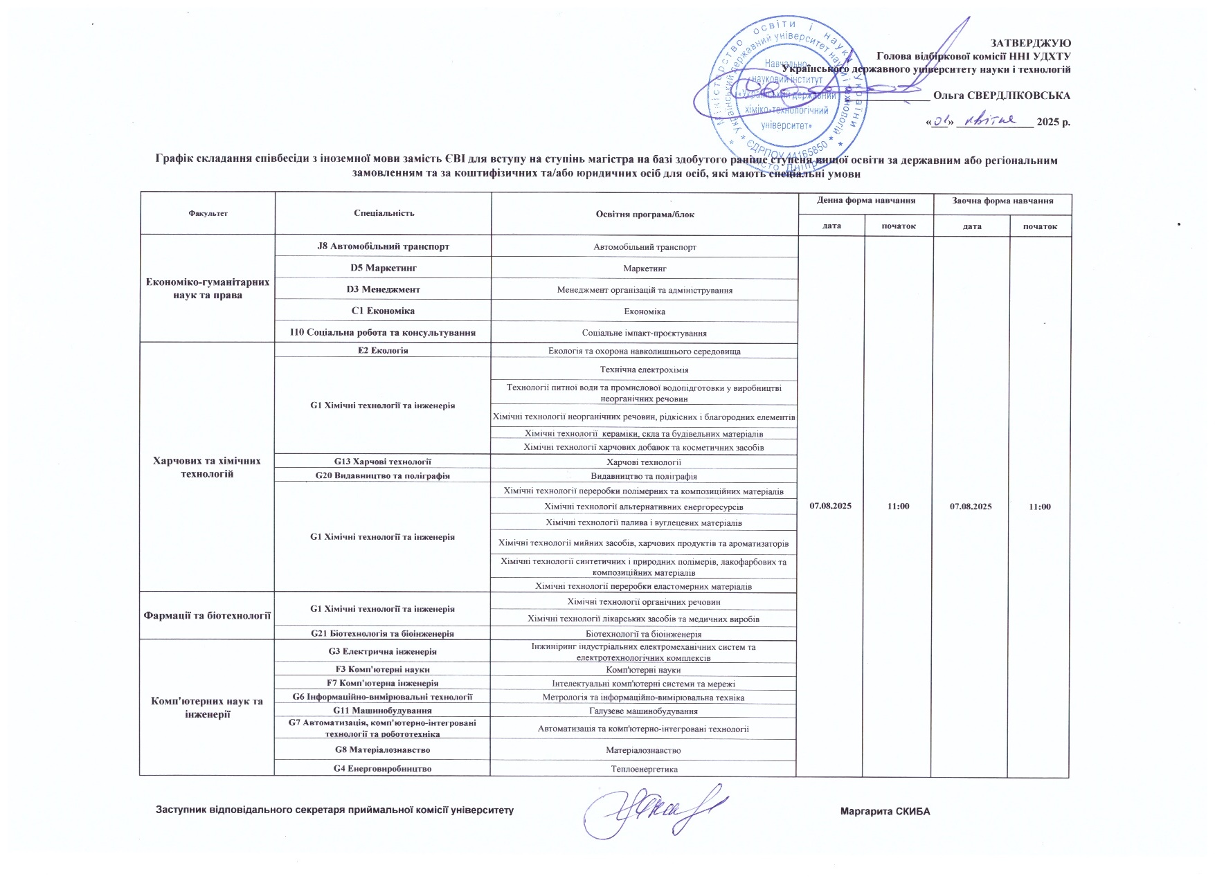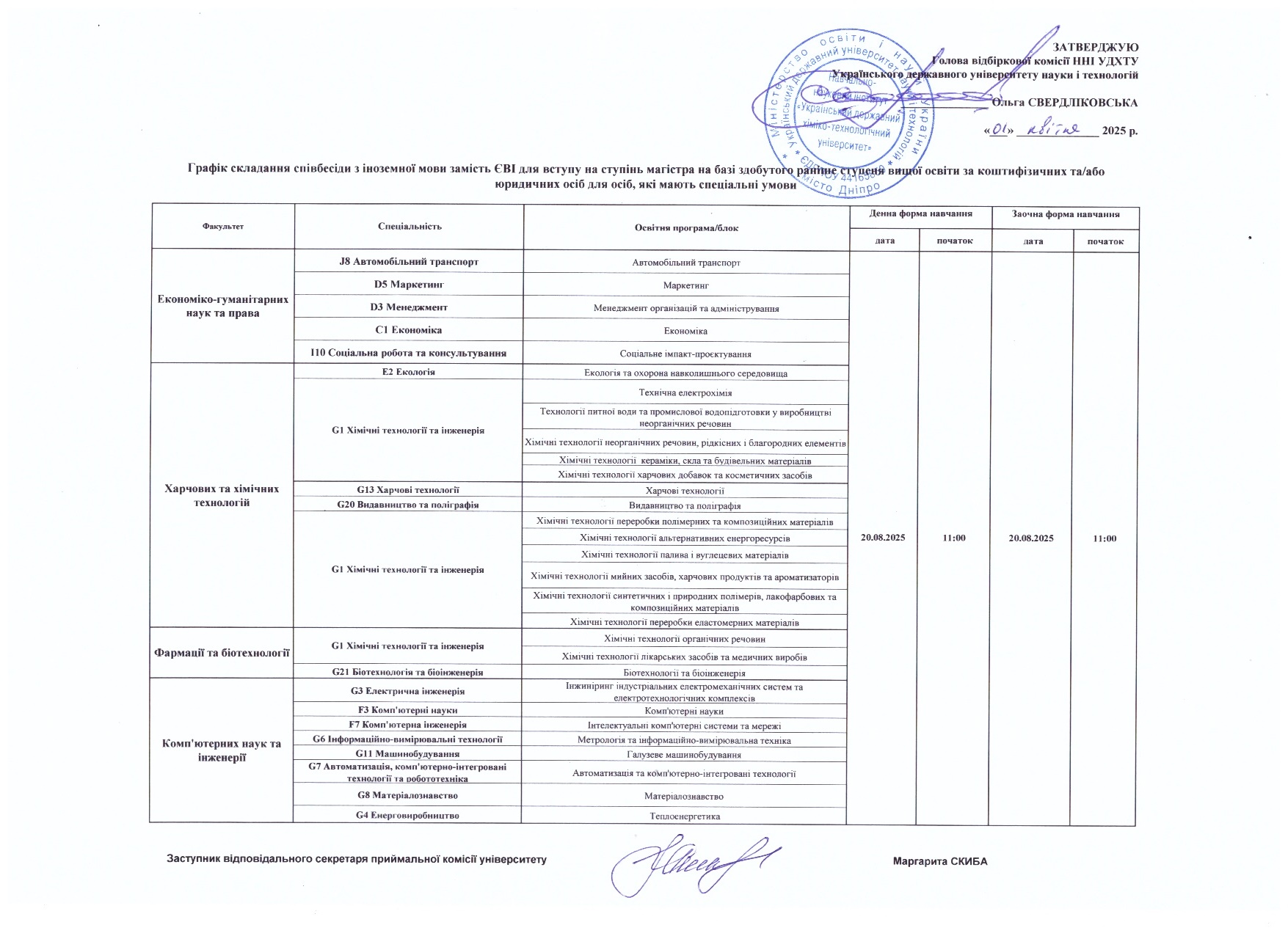 Графік складання співбесіди з іноземної мови замість ЄВІ для вступу на ступінь магістра на базі здобутого раніше ступеня вищої освіти для осіб, які мають спеціальні умови: