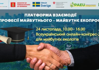Викладачі кафедри та студенти взяли участь у профорієнтаційному заході ПЛАТФОРМА ВЗАЄМОДІЇ «ЕКОПРОФЕСІЇ МАЙБУТНЬОГО – МАЙБУТНЄ ЕКОПРОФЕСІЙ». Всеукраїнський онлайн-конгрес для майбутніх екологів відбувся 24 листопада 2021 і був організовано Професійною асоціацією екологів України (ПАЕУ) та Національним центром сталого розвитку в межах Програми ООН із відновлення та розбудови миру за фінансування урядів Данії, Швейцарії та Швеції.