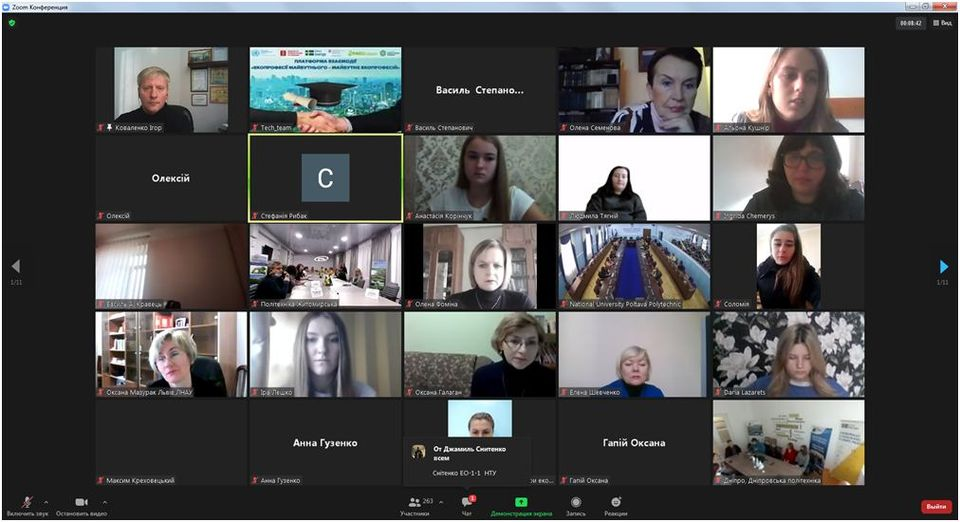 З мотивуючою промовою виступила Олена Славінська, доктор технічних наук, професор, проректор з наукової роботи Національного транспортного університету. Олена Сергіївна акцентувала увагу на важливості якісної підготовки студентів, що навчаються за спеціальностями «Екологія», «Технології захисту навколишнього середовище» та «Менеджмент природоохоронної діяльності», адже робота фахівців цього сектору є надзвичайно важливою для сталого розвитку усіх галузей національної економіки та держави в цілому. Спікери з інших онлайн-студій представляли міста Краматорськ, Житомир, Полтаву та Львів. Захід був насичений також доповідями практиками, представниками провідних підприємств та членами Професійної асоціації екологів України.