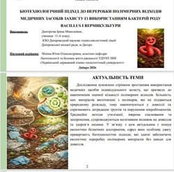 В рамках діяльності гуртка «PRO Безпека» на кафедрі біотехнології та безпеки життєдіяльності виконано науково-дослідницьку роботу на тему «Біотехнологічний підхід до переробки полімерних відходів медичних засобів захисту із використанням бактерій роду Bacillus і вермікультури», автором якої є Дмитрієва Ірина Миколаївна, учениця 11-А класу КЗО «Дніпровський науково-хіміко-екологічний ліцей» під керівництвом асистента кафедри Мініної Юлії Олександрівни. Робота була представлена на конкурсі-захисті науково-дослідницьких робіт Малої академії наук України, де здобула ІІІ місце. У дослідженні розглянуто проблему накопичення полімерних відходів медичних засобів захисту та обґрунтовано можливість їх екологічно безпечної переробки із застосуванням біотехнологічних підходів, зокрема використання бактерій роду Bacillus і вермікультури. Досліджено особливості біодеструкції полімерних матеріалів, визначено ефективність запропонованого методу та окреслено перспективи його практичного застосування.