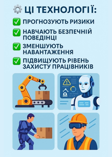 Всесвітній день охорони праці у 2025 році проходив під девізом: “Революційні підходи до здоров’я і безпеки: роль ШІ та цифровізації на роботі” (Revolutionizing health and safety: the role of AI and digitalization at work). Цьогорічна тема зосереджена на впливі новітніх технологій на умови праці та захист здоров’я працівників. Вона охоплює такі інновації, як: передові роботизовані системи, штучний інтелект і машинне навчання, екзоскелети, віртуальна та доповнена реальність. Використання зазначених технологій допомагає зменшити виробничі ризики, попередити нещасні випадки та створювати більш безпечне середовище для кожного працівника.