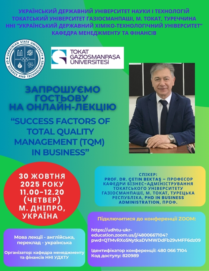 Запрошуємо на гостьову онлайн-лекцію «Success Factors of Total Quality Management (TQM) in Business», яка організовується в межах освітньо-професійної програми «Менеджмент і адміністрування» спеціальності D3 «Менеджмент» першого (бакалаврського) рівня вищої освіти (ННІ УДХТУ, ННІ ДІІТ, ННІ ПДАБА, ННІ ДМетІ) та співробітництва Українського державного університету науки і технологій з Токатським університетом Газіосманпаші (м. Токат, Турецька Республіка).